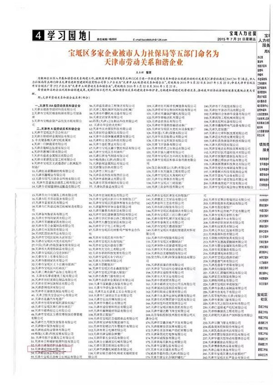 日前,《寶坻人力社保》發布消息,天津通威榮獲“天津市A級勞動關系和諧企業”稱號,有效期至2016年5月22日。該稱號由天津市人力社保局、市總工會、市國資委、市企業聯合會、市工商聯五部門聯合評選,此輪評選包括勞動關系和諧企業及和諧園區。在新一批和諧企業中,寶坻區共有272戶企業獲得“天津市A級勞動關系和諧企業”稱號。
