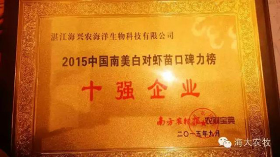2010年4月,湛江海興農曾獲得“中國對蝦種苗20強供應基地”稱號,本次榮獲“蝦苗口碑力榜十強企業”,更有力地反映了海興農這幾年來在蝦苗數量、質量、服務及最終養殖效果方面得到了養戶的認可。