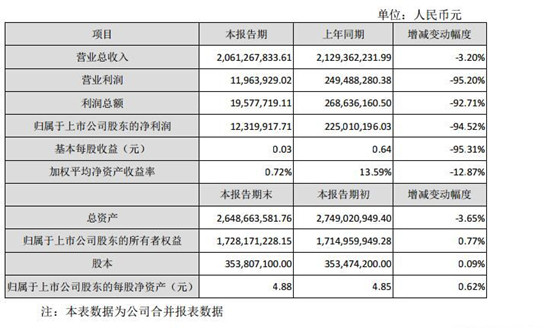報告期內公司實現營業收入為 2,061,267,833.61 元,與上年同期相比下降3.20%;實現營業利潤為 11,963,929.02 元,與上年同期相比下降 95.20%;實現利潤總額為 19,577,719.11 元,與上年同期相比下降 92.71%;歸屬于上市公司股東的凈利潤為 12,319,917.71 元,與上年同期相比下降 94.52%。報告期內利潤指標大幅度減少主要是公司股權轉讓形成的投資收益減少、銷售費用上升所致。