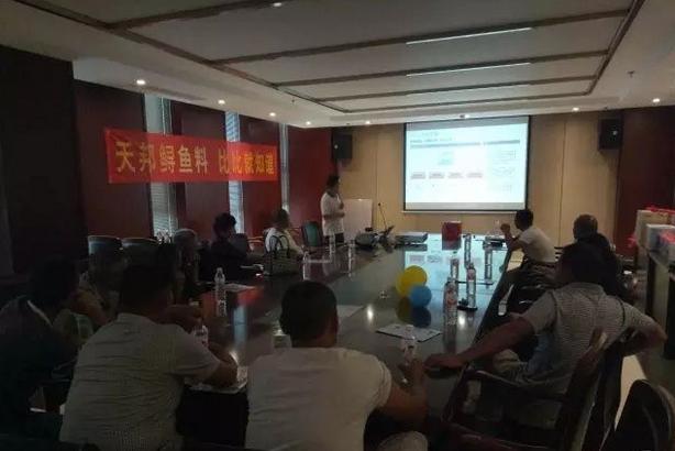 會議由天邦股份飼料事業部北方大區銷售經理趙寶臣主持,技術服務部總經理方波從專業角度對全熟化鱘魚料的優點和價值所在進行了分析:首先,工藝領先:蒸汽壓力達40個大氣壓,蒸汽溫度最高達到150度,高溫高壓條件下讓物料真正全熟化(熟化度達到95%-98%),消化吸收利用率高,讓魚兒不再吃夾生飯,;其次低淀粉配方理念,減少對肝胰臟負擔,同時不含粉末,減少浪費和污染水質;全部使用進口魚油,采用混合機內加油和外噴油相結合的生產工藝,減少油脂氧化,提高魚肌肉中DHA\EPA含量,魚體質更健康,肉質更好;所用原料經發酵工藝處理,改善腸道。