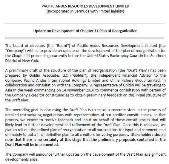 11月10日,太平洋恩利資源發展與中漁集團董事會發布公告,為當前在美國紐約南部破產法庭進行的“破產法第11章程序”提供一份新的重組計劃。
