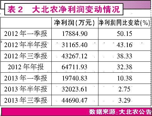正是在這種白熱化的競爭形勢,導致大北農的凈利潤增長率出現持續走低。2012年一季度以來的7個季度中,大北農的利潤率持續下降,雖然2012年的幾個季度凈利潤增長率都能維持在30%以上,但在2013年,前3個季度的增長率卻分別只有10.38%、2.75%、3.29%(見表2)。