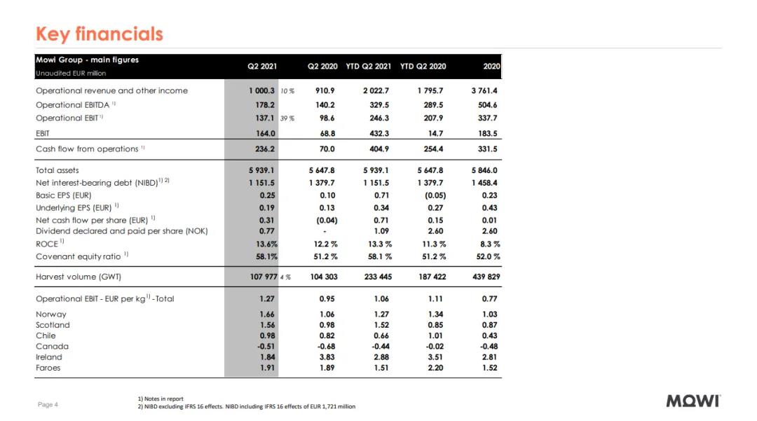 全球最大三文魚生產商Mowi(美威)二季度報告顯示,公司實現營收超過10億歐元,同比增長9.8%,息稅前利潤(EBIT)1.64億歐元(去年同期為6,880萬歐元),三文魚產量為10.8萬噸,平均養殖成本為EUR 4.50/kg。