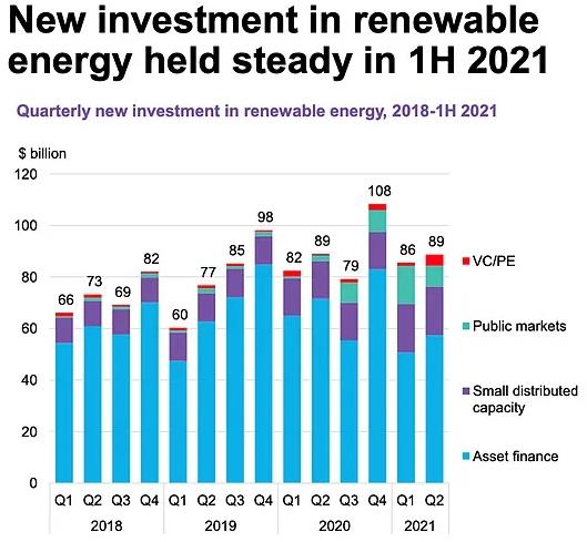 日前,彭博社新能源財經(BNEF)發布了《2021年上半年可再生能源投資跟蹤》,數據顯示,中國2021年上半年對可再生能源的總投資為455億美元,蟬聯全球第一。