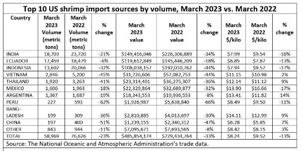 從三月份數據來看,美國蝦類進口量額分別同比下降23%、33%,平均價格同比下跌13%至$8.24/kg,不過進口單價環比上漲1.85%(來源:NOAA)。