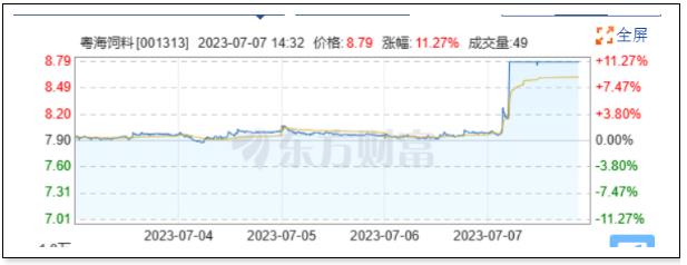7月7日上午,廣東粵海飼料廣東粵海飼料集團股份有限公司(“粵海飼料”,001313)盤中漲停收盤,收盤價8.79元。該股于10點19分漲停,3次打開漲停,截止收盤封單資金為1020.08萬元,占其流通市值0.53%。
