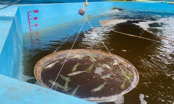 技術員曹光發小心翼翼地從水中提起一個蝦籠,籠內一只只淺青灰色的南美白對蝦跳得正歡。曹光發告訴記者,越是活蹦亂跳,說明它們生活得越好,養殖人員每隔4小時就要觀察一次蝦的狀態,并把調配好的營養餌料通過自動化投料系統撒入蝦池。
