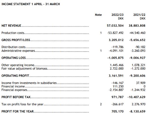 扣除額外財務費用,該公司稅收利潤為70.5萬丹麥克朗,而2021/22財年虧損813萬丹麥克朗。