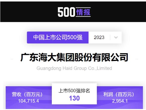 7月11日,2023年《財富》中國上市公司500強排行榜揭曉,海大集團以1047億元營收位列榜單第130位,在農林漁牧行業排名第三,在廣州上市企業中排名第二。