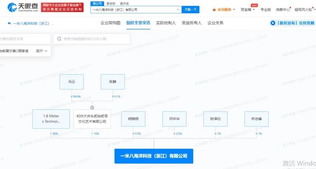 股權全景穿透圖顯示,該公司由1.8 Meters Technology Holding Limited、杭州大井頭貳拾貳號文化藝術有限公司以及胡曉明等4 名自然人共同持股,其中杭州大井頭貳拾貳號文化藝術有限公司由馬云持股99.9%。