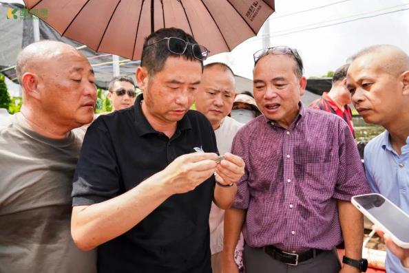 華人科學家蔡偉文(右二)與廣州市華南莧草科技應用研究所所長關海濤(左二)等人現場交流技術。