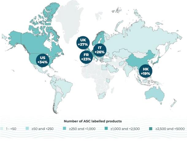 此外,全球近200萬噸養殖海產品通過了ASC認證,消費者可以購買近24,000種帶有ASC認證標簽的產品,比2021年增長了14%。