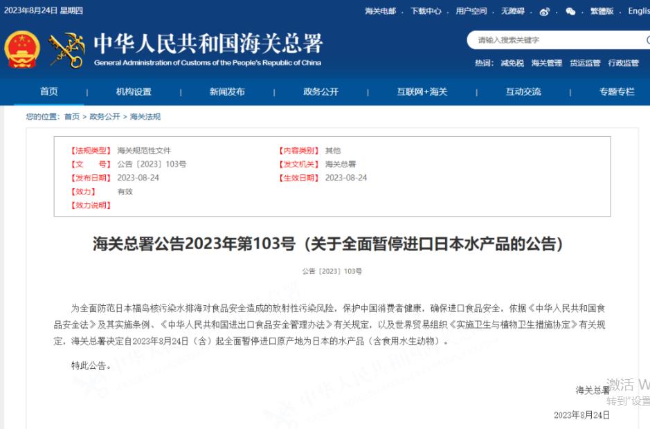 8月24日,我國海關總署發布通告,宣布全面暫停進口日本水產品。