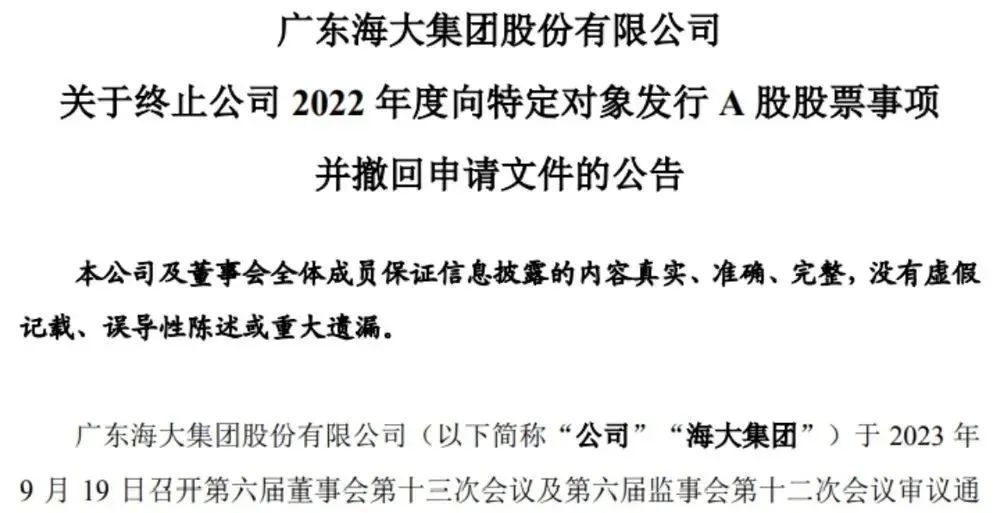 9月19日晚,海大集團發布公告稱,終止2022年度向特定對象發行A股股票,并向深交所申請撤回相關申請文件。