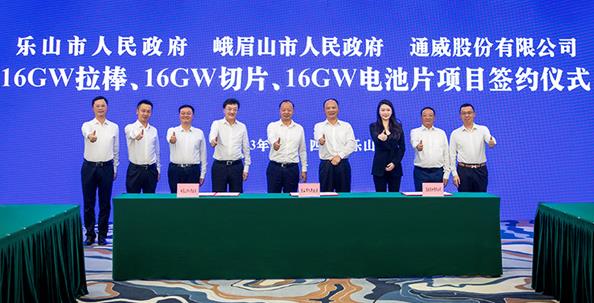 簽約儀式上,樂山市人民政府、五通橋區人民政府、峨眉山市人民政府與通威股份簽訂了《樂山市人民政府、五通橋區人民政府、通威股份有限公司16GW拉棒、16GW切片、16GW電池片項目投資協議》和《樂山市人民政府、峨眉山市人民政府、通威股份有限公司16GW拉棒、16GW切片、16GW電池片項目投資協議》。根據協議,通威股份將在五通橋區和峨眉山市分別投資100億元建設拉棒、切片、電池片項目,項目力爭 2024 年底建成投產,2025 年底達產。