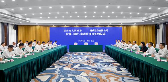 9月28日,通威股份在樂山投資拉棒、切片、電池片項目簽約儀式成功舉行。樂山市委書記馬波,全國人大代表、全國工商聯副主席、通威集團董事局劉漢元主席出席并致辭。樂山市委副書記陳揚杰、副市長張國清,通威股份董事長、CEO劉舒琪出席簽約儀式。通威股份副總裁、永祥股份總經理李斌,通威太陽能總經理周華,五通橋區委書記劉勇,區委副書記魏陽東,峨眉山市委書記李良,市委副書記、市長陳林強等領導參加。簽約儀式由樂山市委副書記、市長陳光浩主持。