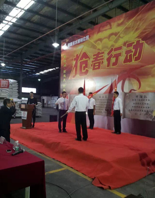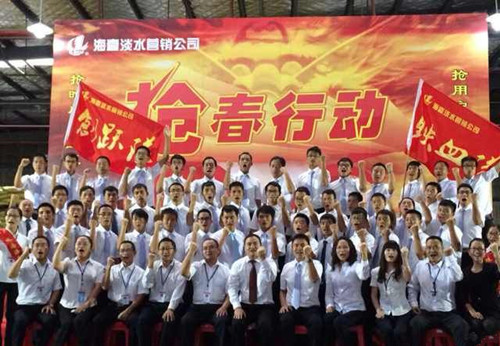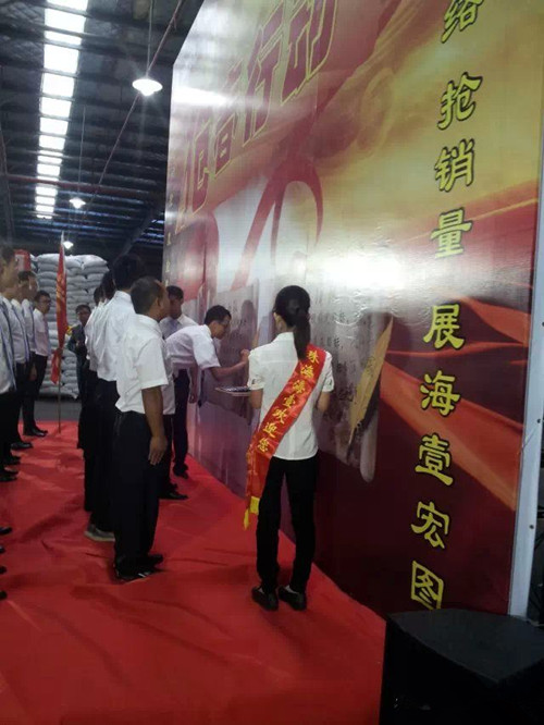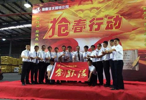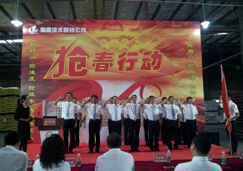 所謂一年之際在于春,轉眼2014年已踏進11月份,這也預示著今年水產行業旺季即將結束,新一輪更激烈的戰爭即將開始。為率先搶占機遇,打敗競爭對手,11月8日上午海壹淡水全體營銷人員正式召開了2015年“搶春行動”的啟動儀式,立下軍令狀,為明年海壹淡水銷量更上一層樓而奮斗。而10月21日和10月27日分別在江門和中山舉行的搶春活動,宣傳造勢正為這次的啟動儀式拉開了序幕。