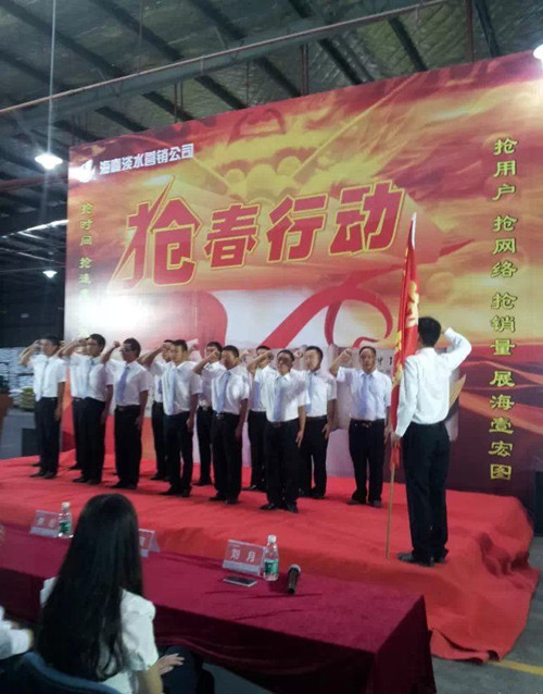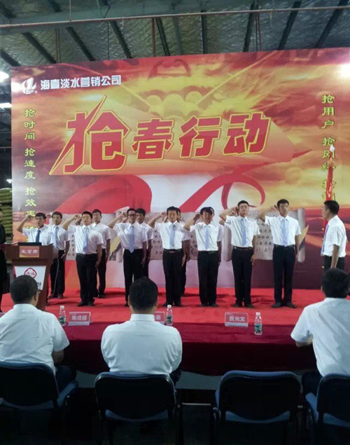 本次會議具體分三個環節:1、領導致辭;2、“搶春行動”相關安排及考核方案公布;3、各部門宣誓。隨著義勇軍進行曲的響起,會議在上午9點正式開始,各營銷人員以軍人的姿勢列隊進場。首先由海壹淡水總經理鄧金雁致開幕詞,鄧總指出:今年11月到明年3月是明年銷量是否增長至關重要的時期,必須在這段時期做好基礎工作才能為明年打一場漂亮的仗。接下來由市場經理賈光文和周爭志分別對“搶春行動”相關安排和考核方案作宣講。其次,分別是市場部的沖鋒隊、鐵血隊、創躍隊以及由公司各部門組成的后勤保障隊上臺宣誓,立下軍令狀。各隊正如他們的隊名一樣,充滿決心和沖勁,聲音之響亮,讓人深深地感受到海壹團隊的力量。最后,隨著鄧總在軍令狀上簽字為這次“搶春行動”的啟動正式拉下帷幕。