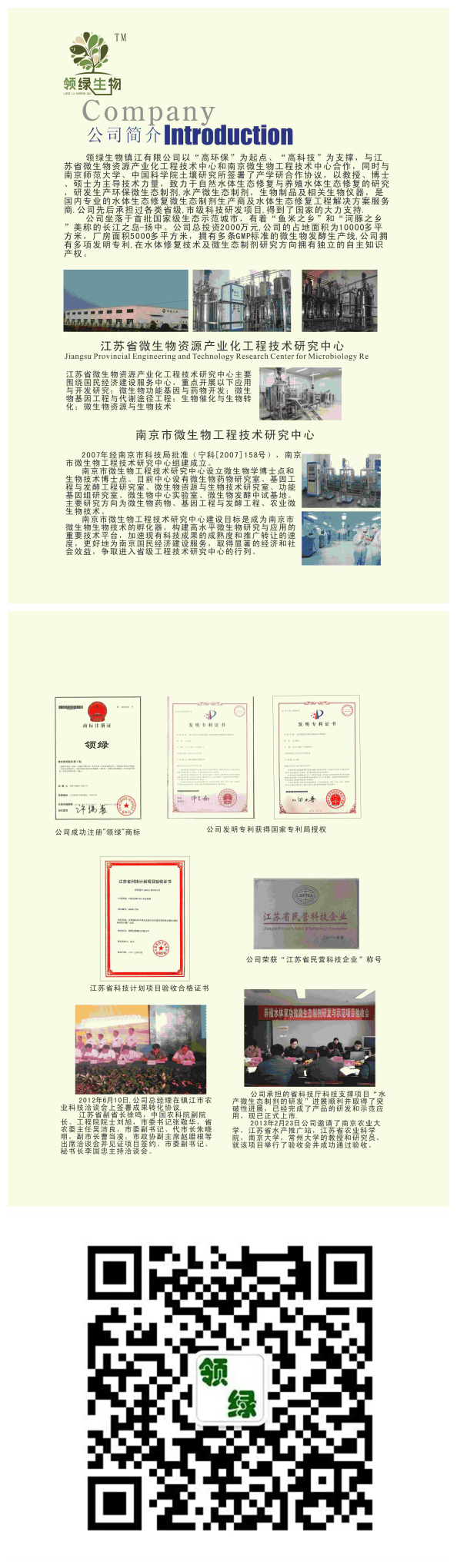 領綠生物鎮江有限公司是一家專業從事微生物技術研發、生產、銷售及推廣服務的生物高科技公司。公司主營水產微生態制劑系列、畜禽微生態制劑系列、環保微生態制劑系列研發,生產與銷售。公司與南京師范大學,中國科學院南京土壤研究所、江蘇省微生物資源產業化工程技術研究中心進行了科研合作;公司擁有2座標準廠房,占地面積達到4000平方米,2012年公司被江蘇省評為“江蘇省民營科技企業”;同時公司先后于2011年承擔了江蘇省科技支撐計劃“在養殖水體中凈水及促生長雙重功效的復合微生態制劑研發與推廣示范”、并于2013年順利高分通過驗收;2012年承擔揚中市創新基金“淡水養殖水體生態修復專用復合微生態制劑產業化與應用示范”,并于2014年4月順利完成產品研發,項目高分通過驗收,同時申請發明專利13件,現已授權2件。