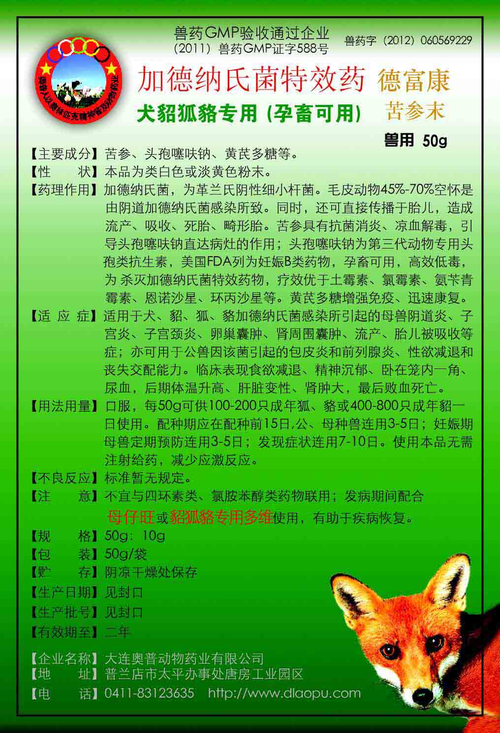 【用法用量】口服,每50g可供100-200只成年狐、貉或400-800只成年貂一日使用。配種期應在配種前15日,公、母種獸連用3-5日;妊娠期母獸定期預防連用3-5日;發現癥狀連用7-10日。使用本品無需注射給藥,減少應激反應。